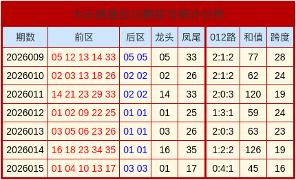 上期大乐透的开奖号码中,和值为45,跨度为16,012路比为0:4:1。