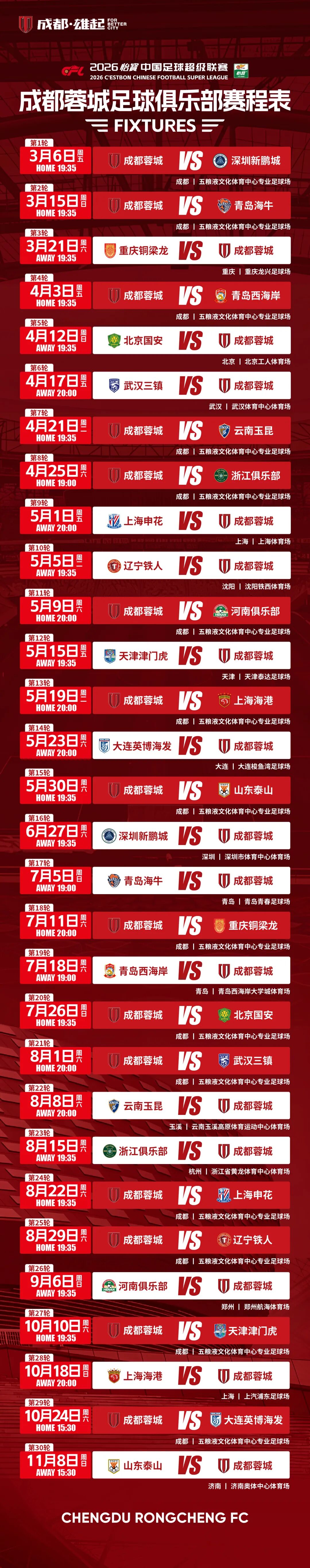 2026赛季中超联赛大幕将启,中足联官方2月14日公布了圆善赛程,新赛季中超将于3月6日开赛,11月8日截止。揭幕战放在成皆,3月6日,成皆蓉城将在主场迎战深圳新鹏城,开启新赛季的征途。在多支竞争球队负分起步的情况下,球队将再次向最高荣誉发起冲击。
