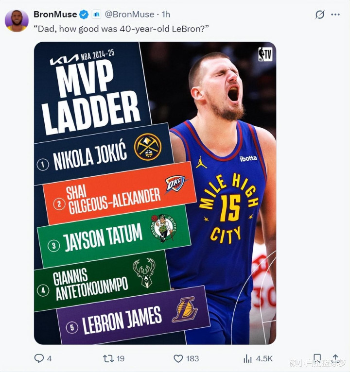 最新的官方MVP榜单,40岁的勒布朗-詹姆斯依然冲入前五,湖东谈主媒体高呼:“爸爸,40岁的勒布朗这样出色吗?”