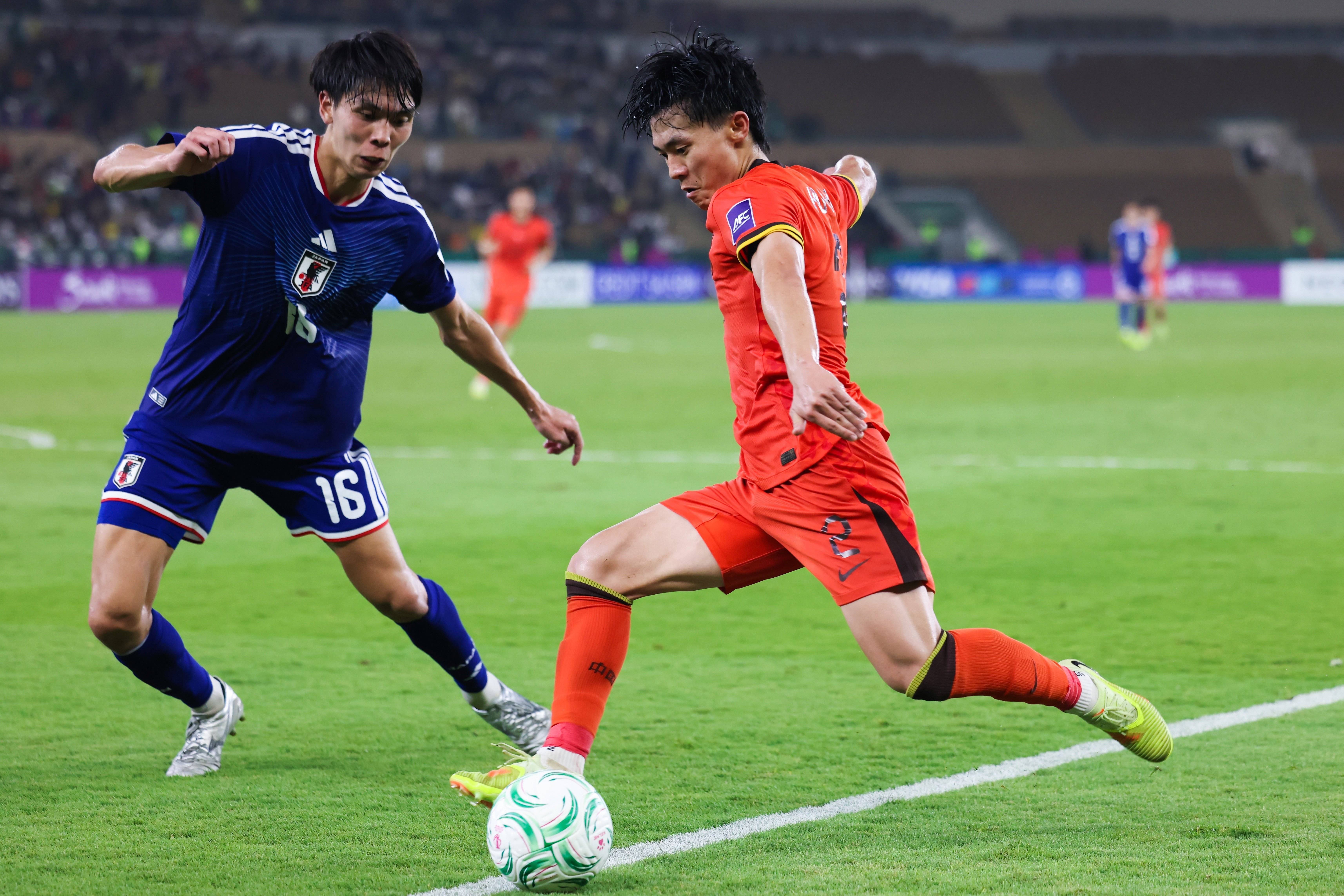 1月24日,中国队球员王钰栋(左)在比赛中。新华社记者 王海洲 摄第12分钟,大关友翔在禁区内的射门折射中计,为日本队首开纪录。第20分钟,小仓幸成在中国队禁区前抢断后抽射到手,日本队以2:0逾越。
