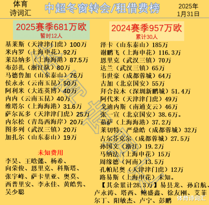 不错发现,2024赛季的冬窗,中超一共有29笔引援产生用度,累计金额约为957万欧(不计较路易斯),粗浅7217万东说念主民币。而2025赛季冬训末端今天,一共12笔引援产生转会费、租出费,还有十几笔暂时未知,当今总用度为681.1万欧元,接近5136万东说念主民币,达到客岁的70%。